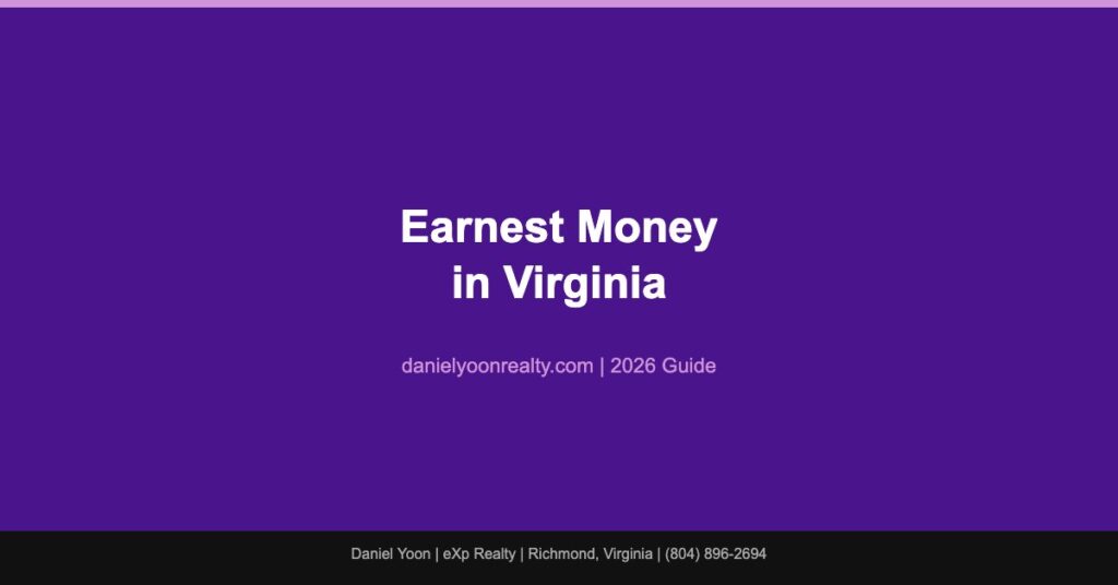 Earnest money is the deposit you put down when you make an offer on a home. In the Richmond, Virginia market, the standard amount is 1% to 3% of the purchase price. On a $400,000 home, that is $4,000 to $12,000. This money shows the seller you are serious and goes toward your down payment or closing costs at settlement.